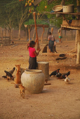 The village appeared to be self-sufficient with chicken, pigs, goats, buffalo, and dogs running around everywhere. Dry rice fields encircled the village of more than 500 people. In the center of the village lies a water pump, squat toilet, and concrete school building; these were all thanks to a joint cooperation with a Canadian group. After a walk around the village, it was obvious the women were doing their part. Young women pounded rice.