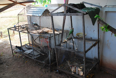 Now, a break from the travel blog to discuss the treatment of animals in Laos. I warn sensitive animal lovers now that the following reading may not be suitable for you. In one of our numerous guidebooks, we were warned that a traveler is sure to see extremely poor treatment of animals in Laos. The book warned of caged monkeys, beaten dogs, and tortured birds. It's easier read than seen! Caged forest birds and monkeys are common sights in Laos. In fact, we've seen a Buddhist wat that had 5 or 6 caged monkeys and one bus stop contained a caged monkey, parrot, hornbill, and other forest bird.